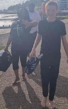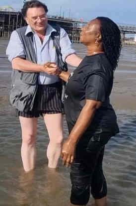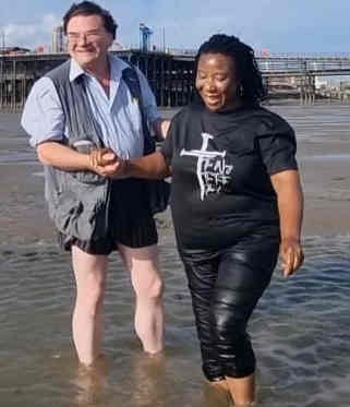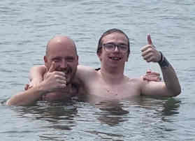 After the baptisms we sat on the "beach" for a bit [Southend is really polluted water and mud flats with amusement arcades on the pier and shouldn't really be called a "beach"]. And we observed a most beautiful thing. Zak, who had brought his brother Terry to faith in Jesus and baptism, taught Terry to swim. In front of us all as we sat at the waterside. Terry was initially frightened of water, but we watched as Zak taught Terry to float on his back, then took him out deeper to learn to tread water... and then to swim. Firstly cradled in his older brother's arms, but then independently. It was a beautiful thing to behold. The spiritual parallels were obvious. Here they are afterwards: