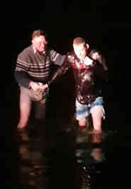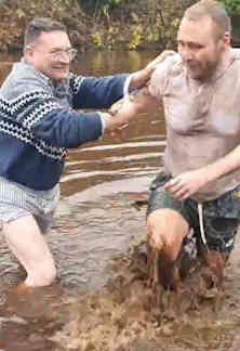 - a very muddy as well as cold baptism, emerging covered in mud. And then the sun came out brightly straight away as he emerged.
