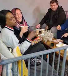 Carl and Emil seem typical. They work together at a hospital, and one lunch time, they and another man were chatting in lunch break. Emil said he'd like to be baptized into Jesus but was sceptical of churches he'd visited. The other man said that he follows Croydon Church in a Pub online and they preach the Bible and baptize people with no other agenda. And he recommended Emil follow us. Then Carl said that he too had turned to Jesus Christ and would like to be baptized, but was also sceptical of churches having had a family member become a JW many years ago. And so Carl and Emil followed us and contacted us. Then with the help of the app and online contact, decided for baptism. The initial plan had been to do the baptism in the sea near where they live, but the cold snap was really bitter so we gave in and after some hours discussion in a coffee shop, with joy we baptized them in a swimming pool [no cameras allowed in public swimming pools so no pics]. Here we are after our three hour session in the coffee shop on that bitterly cold day: