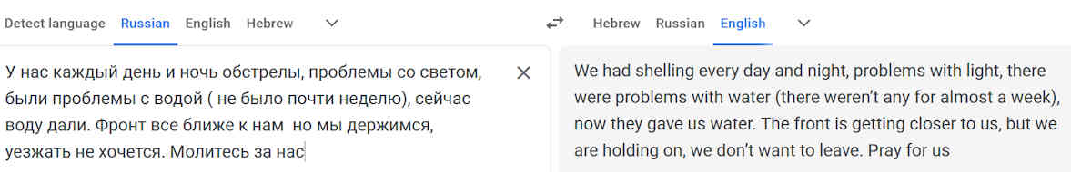 No water and electricity [Google wrongly translates as "light"] and stuck in an apartment with your son who can't go out for fear of being arrested by the Military Police... quite apart from the constant shelling and sirens... is pretty much unbearable. It's very hard to see a concrete way to resolve all these many issues, but we appreciate your efforts as we try to in His strength.